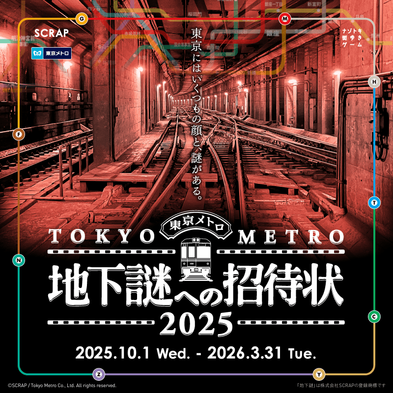 全世界で累計1,490万人以上を動員しているリアル脱出ゲームを企画制作する株式会社SCRAP(本社:東京都渋谷区、代表:加藤隆生)は、東京地下鉄株式会社(本社:東京都台東区、代表取締役社長:小坂 彰洋、以下「東京メトロ」)とともに、「ナゾトキ街歩きゲーム」の人気シリーズ「地下謎」の完全新作『地下謎への招待状 2025』を、本日10月1日(水)よりスタートいたします。さらにイベント内に登場する旅先案内人として、菊川怜さん、吉川正洋(ダーリンハニー)さん、リュウジさん、ヨビノリたくみさん、けんたさん、東京カフェちゃんねるさん、土橋真さん、とに〜さんの8名を起用いたします。