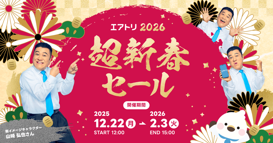 ITの力で、エアトリ旅行事業、ITオフショア開発事業、訪日旅行事業・Wi-Fiレンタル事業、メディア事業、投資事業(エアトリCVC)、地方創生事業、クラウド事業、マッチングプラットフォーム事業、CXOコミュニティ事業、HRコンサルティング事業、航空会社総代理店事業、レンタカー事業、海外ツアー事業、エンタープライズDX開発事業、法人DX推進事業・ヘルスケア事業(以降の事業は投資先にて注力)、人材ソリューション事業、クリエイティブソリューション&DX事業、AIロボット事業、ゴルフライフサポート事業、外貨自動両替機事業と町家宿泊・日本文化体験事業を含む全21事業を手掛ける株式会社エアトリ(本社:東京都港区、代表取締役社長 兼 CFO:柴田 裕亮、証券コード:6191、以下当社)は、本日12月22日(月)より「エアトリ超新春セール」を開催いたします。