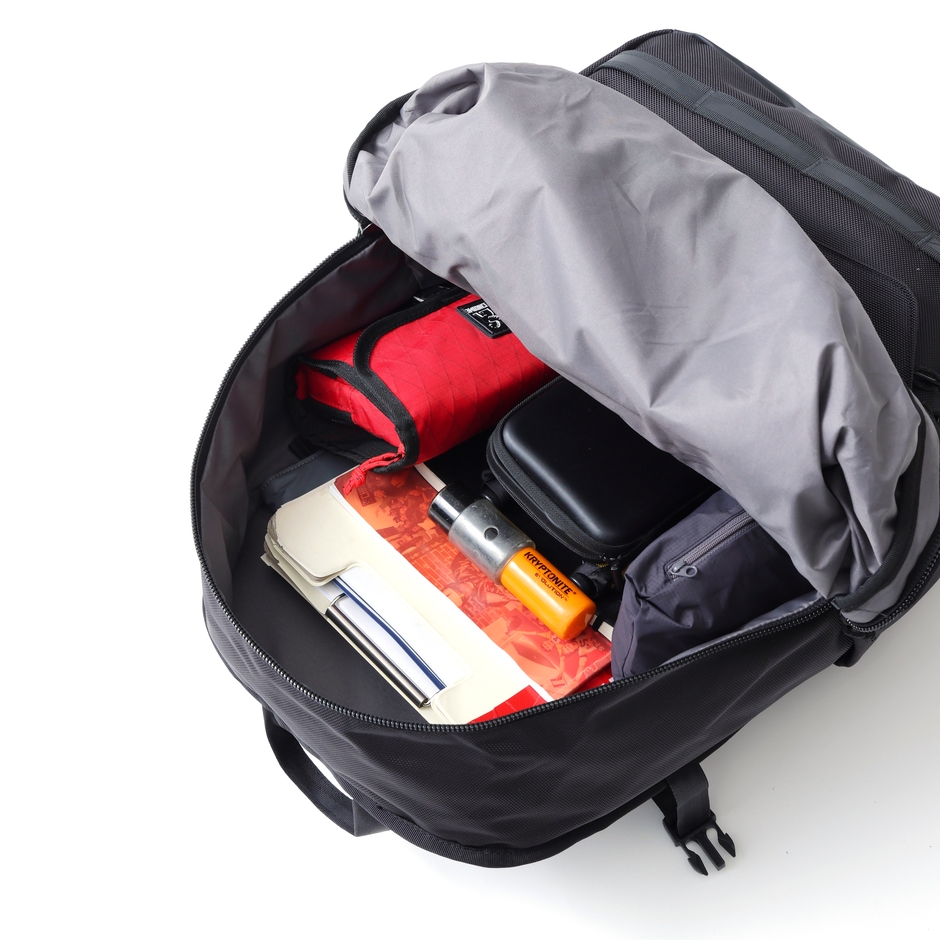 外装には長きにわたって使用できる頑丈な1680Dリサイクルポリエステルを採用。内部には完全防水の210デニール コーティングナイロンを使用し、突然の雨や水濡れからも大切な荷物をしっかりと守ります。さらに、衝撃吸収パッド入りのデュアルガードPCスリーブを搭載し、PCへのダメージリスクを大幅に低減します。