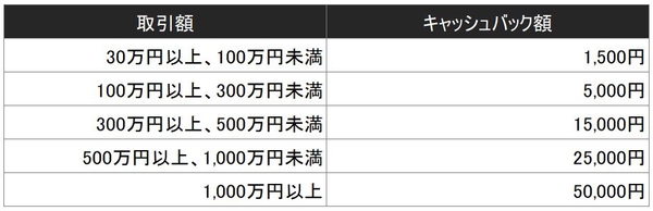 ・キャンペーン内容:取引額に応じて最大5万円をキャッシュバック