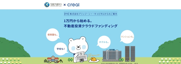 株式会社ブリッジ・シー・キャピタル(本社:東京都中央区、代表取締役社長:横田 大造、以下「当社」)は、株式会社SBJ銀行(本店:東京都港区、代表取締役社長:富屋 誠一郎、以下「SBJ銀行」)から、当社の運営する不動産投資クラウドファンディングサービス「CREAL」の紹介を行う、「SBJ銀行×CREAL」の取り組みにおいて、キャンペーンを実施することをお知らせいたします。両社は、2020年6月15日に業務提携契約※を締結しており、本キャンペーンによって、両社の取り組みをより加速させることを見込んでいます。