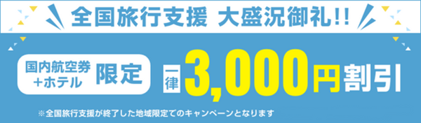 全国旅行支援大盛況につき、御礼企画!!国内エアトリプラス(国内航空券+ホテル)において、一律3,000円割引の独自キャンペーンを開催!!