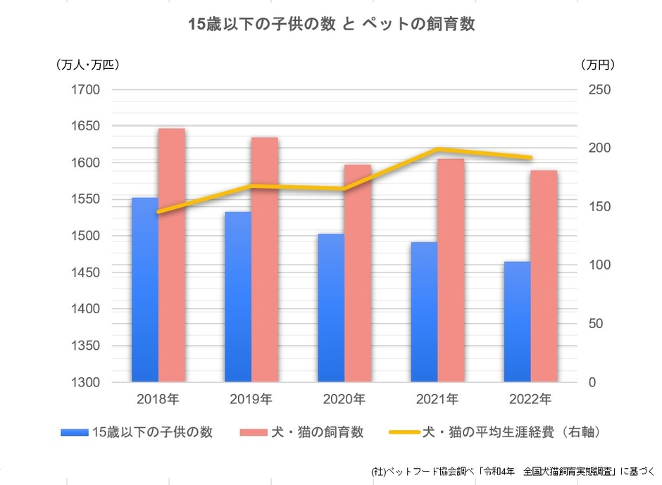 毎年のように合計特殊出生率の低下が言われ、子どもの人口が減る中、ペットの飼育数はこの10年でやや低下気味ながらほぼ横ばいの状況が続いています。