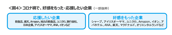 おうち時間の増加や自粛期間といった生活の変化に伴い各社で様々な対応がみられる中、コロナ禍で「好感を持った」「応援したい」と思う企業をそれぞれ自由回答で聴取した。応援したい企業では「飲食店、楽天、Amazon、地元の飲食店、ユニクロ、旅行会社、日本企業、アイリスオーヤマ、ANA、イオン」など、好感を持った企業では「シャープ、アイリスオーヤマ、ユニクロ、Amazon、イオン、アパホテル、ANA、楽天、マクドナルド、オリエンタルランド」など、国内企業を中心に多数の回答があがった。また「地元/近所の〜」といった地元を応援する回答も多くあがった。<図4> 企業名は回答の多い順に記載。