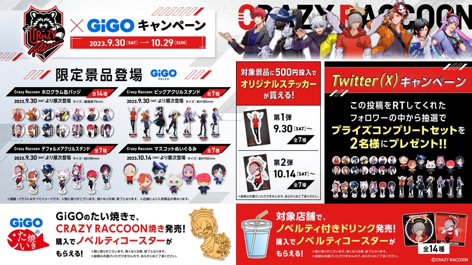 株式会社GENDA GiGO Entertainment(本社:東京都港区 代表取締役社長:二宮 一浩 以下当社)は2023年9月30日(土)より、GiGOグループのお店におきまして、プロゲーミングチーム『Crazy Raccoon』(クレイジーラクーン)とコラボレーションした当社限定のキャンペーンを開催いたします。