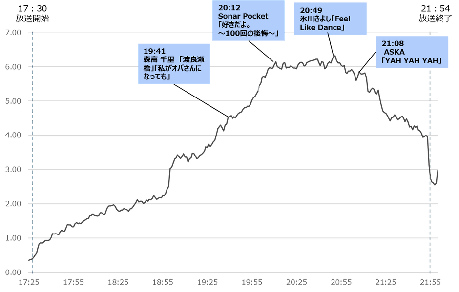 また21時台では、21:08にASKAさんが「YAH YAH YAH」を歌唱するシーンで再び5.1%まで上昇していました。