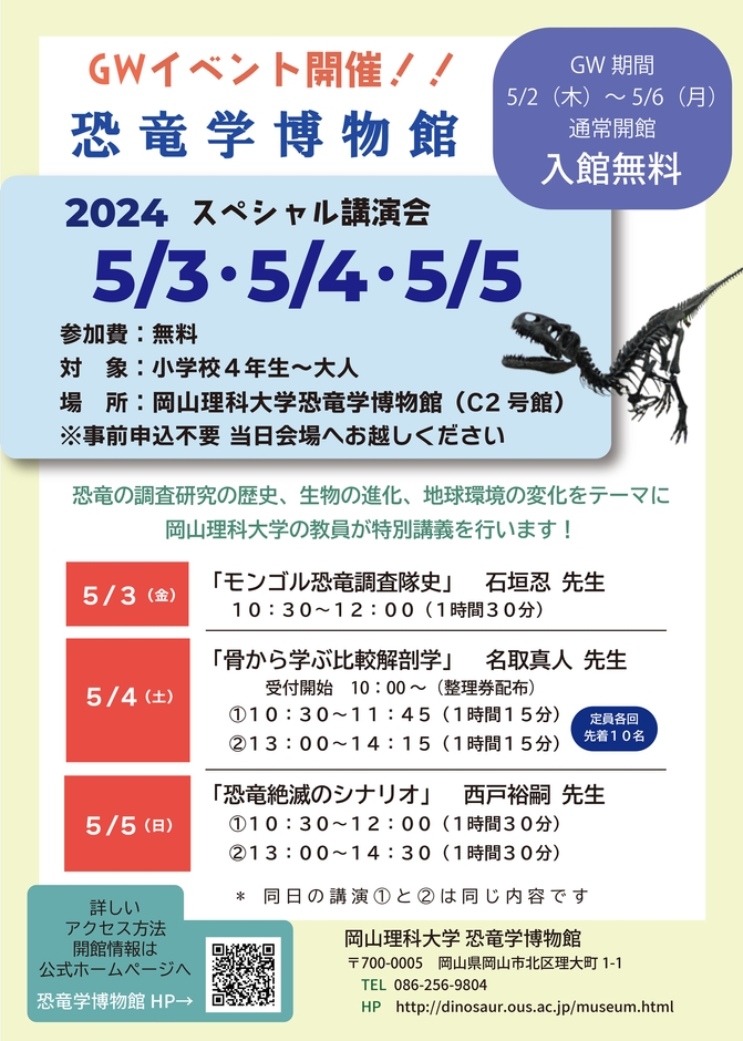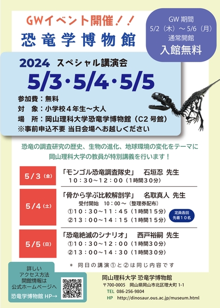 【岡山理科大学】GWイベント開催!!恐竜学博物館 スペシャル講演会|日時:2024年5月3日~5日!参加費無料