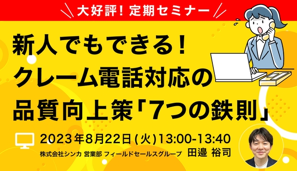 コミュニケーションプラットフォーム「カイクラ」の開発・販売を行う株式会社シンカ(本社:東京都千代田区、代表取締役社⻑ 江尻高宏、以下、「シンカ」)は、無料オンラインセミナー「新人でもできる!クレーム電話対応の品質向上策「7つの鉄則」」を2023年8月22日(火)に開催いたします。
