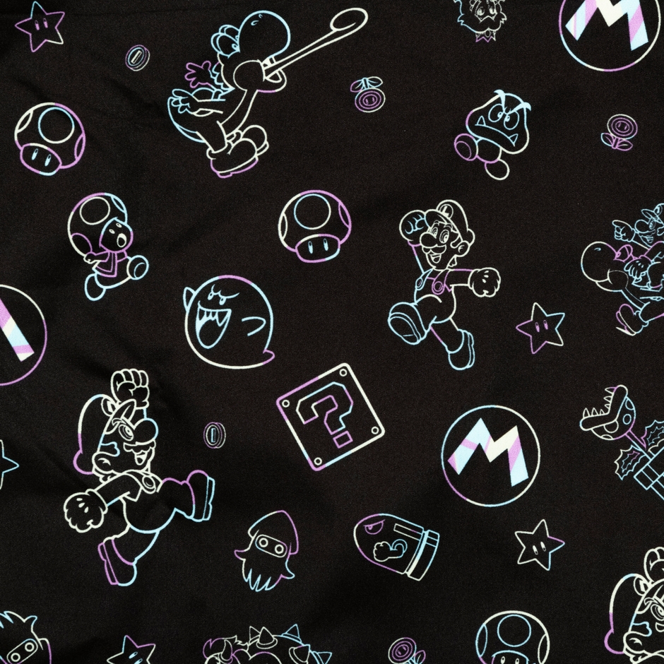 マリオなどのキャラクターをはじめ、キノコやスターなどアイコニックなモチーフを散りばめた柄。クールな印象の中に、こちらを見ているテレサや転んでいるクリボーなども愛くるしいアイテムです。