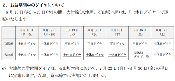 ※臨時列車の運転に伴い、一部列車の発着時刻を変更いたします。詳しくは、京阪電車のホームページ「電車・駅のご案内」(7月22日(月)に掲載予定)をご覧ください(ダイヤ検索には対応しておりません)。
