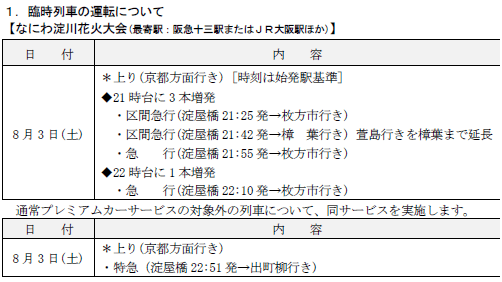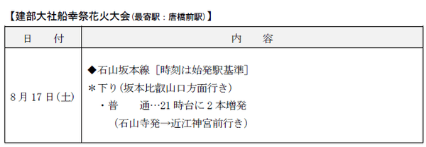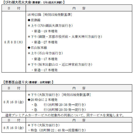 京阪電気鉄道株式会社(本社:大阪市中央区、社長:平川良浩)では、沿線で開催される花火大会・京都五山送り火に合わせて臨時列車を運転します。また、お盆期間中のダイヤについてもお知らせいたします。概要は、下記のとおりです。
