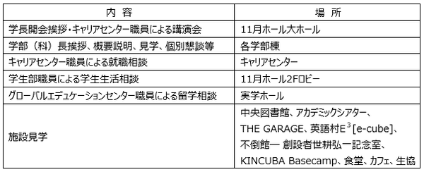 さらに、大阪会場では、学長による開会挨拶、キャリアセンター職員によるキャリア講演会のほか、学生の起業を支援するKINCUBA Basecampなどの施設見学、さらに留学希望者が増えていることを踏まえて、グローバルエデュケーションセンター職員による留学相談も行います。