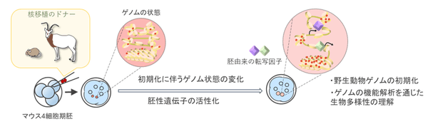 研究グループは、従来のクローン技術では用いられたことのない停止状態のマウス初期胚内で、様々な動物細胞核に、重要な初期化現象である胚性遺伝子※4 の活性化を誘導することに成功しました。また、この手法により、野生環境で絶滅したとされるシロオリックスの死後個体から回収した組織で初代培養細胞を樹立し、その細胞核から胚性遺伝子の活性化に成功しました。本研究成果により、実験動物のマウス胚を用いて、多様な野生動物のゲノム機能を解析することが可能となります。