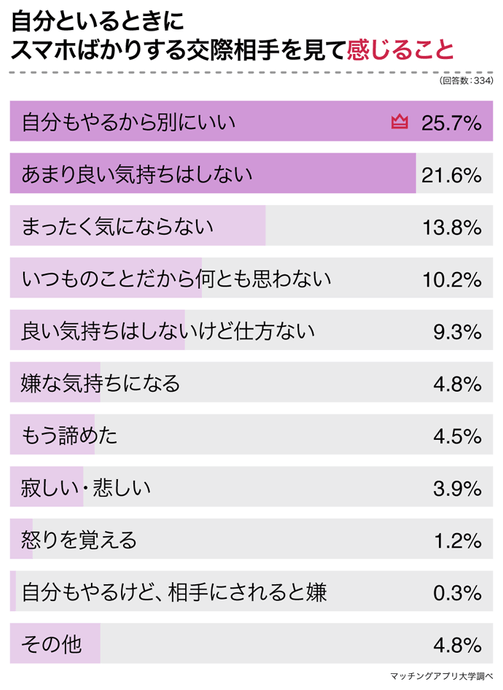これまでは「彼氏・彼女が自分といる時間にスマホばかり見ていて悲しい」と悩んでいた人も、今回のアンケートで「交際相手が自分といる時間が楽しくないと思っているとは限らない」ということが分かったのではないでしょうか。