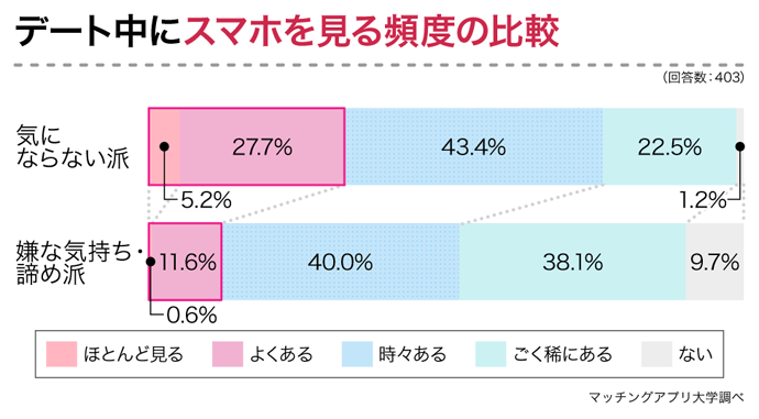 ここで、気にならない派と嫌な気持ち・諦め派で「デート中にスマホを見る頻度」について比較してみると、次のような結果でした。