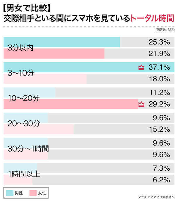 デート中のスマホ閲覧は、5割以上の男女が10分以内