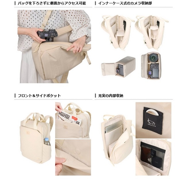 標準レンズ付き一眼カメラと、交換レンズ1本の収納が可能。バッグを下ろすことなく側面から素早くカメラにアクセスできます。