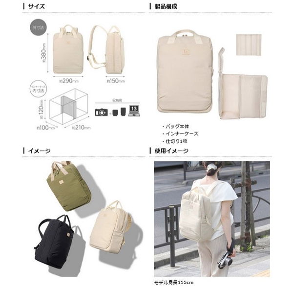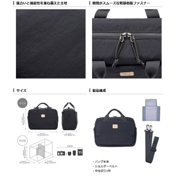 ミラーレス一眼カメラと交換レンズ、財布やスマートフォンなどを収納するのにちょうどいいコンパクトなサイズ感で、カメラを使わない日も普段使いのバッグとして活躍します。