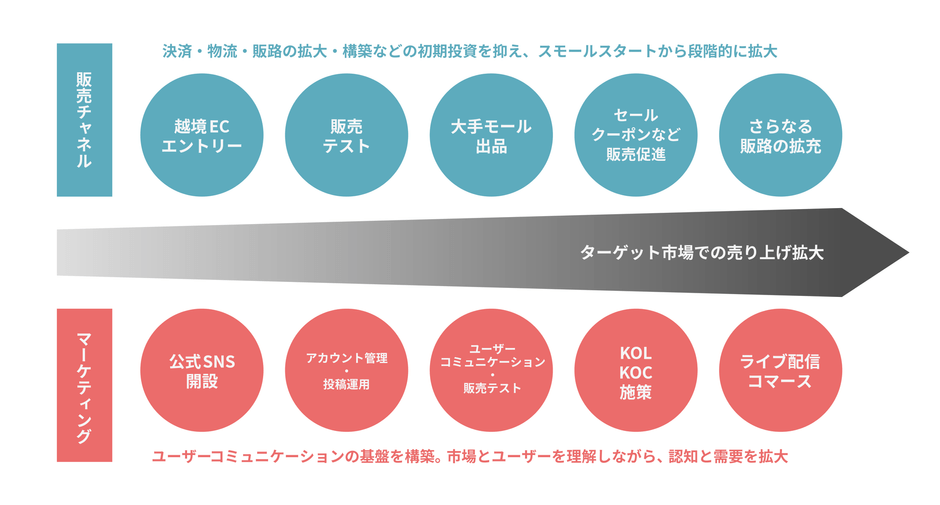 販売チャネルの確立とマーケティングの足並みを揃え、実績を鑑みながら柔軟に拡大する「アジャイル型」で施策を展開。初期リスクを抑えつつ、成果に基づいた次の投資判断が可能な設計です。