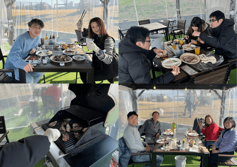 屋外BBQスペースを活用した開放的な空間で、カンカン焼き・酒蒸しなど様々なスタイルで牡蠣を調理できる点も特徴です。