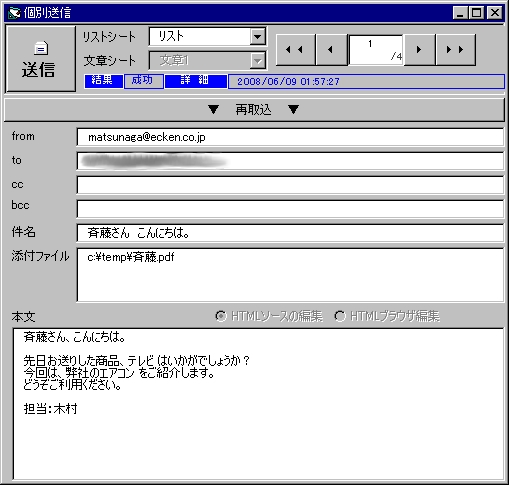 2008年6月27日 09:30株式会社EC研究所(本社:東京都千代田区、代表:松永 義弘)は、入力項目と添付するファイルを簡単・柔軟に指定でき、多くの送信先に対して似た内容のメールをそれぞれに合わせた情報を差し込みながら(以下 流し込み)一括送信できる『ビジネス用EXCELメール一括送信~流し込み対応版~』の新バージョンを2008年6月27日より販売開始いたしましたのでお知らせいたします。