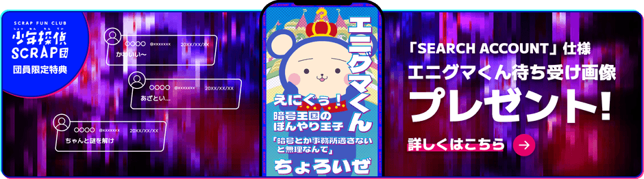 『SEARCH ACCOUNT』をご購入の団員には、「SEARCH ACCOUNT仕様エニグマくん待受け画像」をプレゼントいたします!!