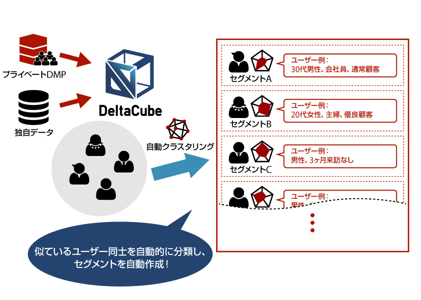 「DeltaCube」は、DMPに蓄積された膨大なユーザーデータをデジタルマーケティング施策に活用する際に、顧客の属性やウェブサイト上での行動などに基づき、適切なグループに分類する(=セグメントを作成する)作業を自動化・効率化できるツールです。そして、このたび追加された自動クラスタリング機能は、DMPに蓄積された膨大なデータをもとに、類似ユーザー同士を分類して自動でセグメントを作成する機能です。