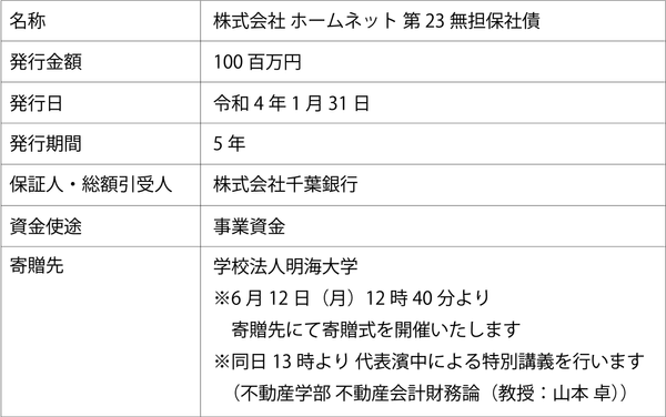 テクノロジーで気軽な住み替えをサポートする株式会社 property technologies(以下「当社」)のグループ会社である株式会社ホームネット(以下「ホームネット」)は、株式会社千葉銀行(以下「千葉銀行」)を引受先とする「地方創生私募債(愛称:みらいはぐくみ債)」を発行し、発行手数料の一部を用いて学校法人明海大学(以下「明海大学」)の学校教育促進につながる物品を寄贈いたします。