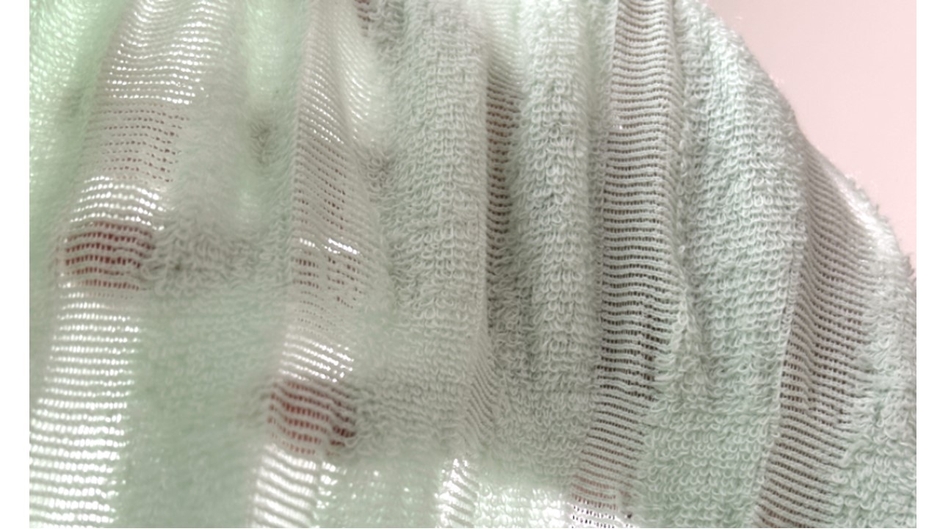 極細糸を使用しているので、薄くて軽いのも特長の一つ。独自の透け感はエレガントで見た目にも涼やかです。多くの人が夏の寝具に求める「肌触りのよさ」「涼感」「軽さ」「通気性」のすべてを兼ね備えているのが「そよ風ケット」です。