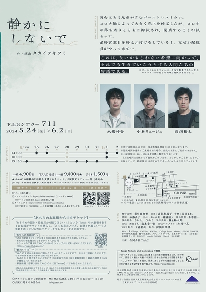 合同会社 TAAC(代表:タカイアキフミ)主催、『静かにしないで』が2024年5月24日 (金) 〜 2024年6月2日 (日)に下北沢シアター711(東京都 世田谷区 北沢 1-45-15)にて上演されます。この度ビジュアルと演出・出演者からのコメントが公開されました。
