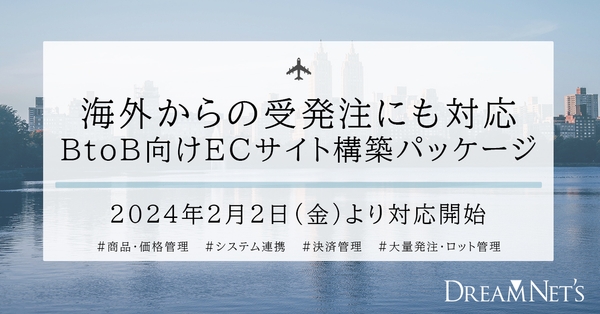 株式会社ドリームネッツ(本社:広島県福山市、代表取締役社長:井上 一成)は、CRMを搭載したBtoB向けECサイト構築パッケージ(以下、本製品)において、2024年2月2日(金)より海外からの受発注業務にも利用可能なシステム構築へ対応いたします。