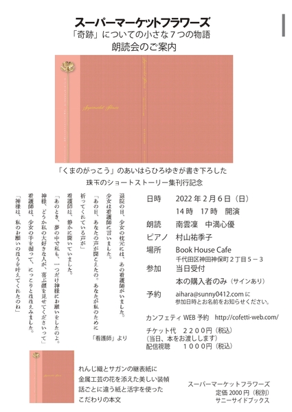 株式会社サニーサイド(東京都港区、代表:あいはらひろゆき)主催による『スーパーマーケットフラワーズ朗読会』が2022年2月6日(日)にブックハウスカフェ(東京都千代田区)にて開催されます。チケットはカンフェティ(運営:ロングランプランニング株式会社、東京都新宿区、代表取締役:榑松 大剛)にて1月14日(金)10:00より発売開始です。