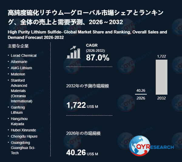 QYResearchが発表した新たな市場調査レポート「高純度硫化リチウム―グローバル市場シェアとランキング、全体の売上と需要予測、2026~2032」によると、世界の高純度硫化リチウム市場規模は2025年の約22.58百万米ドルから2026年の40.26百万米ドルへと順調に拡大すると見込まれ、予測期間中は年平均成長率(CAGR)87.0%で成長し、2032年には1722百万米ドルに達すると予測されている。