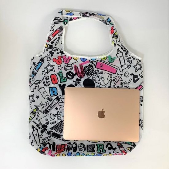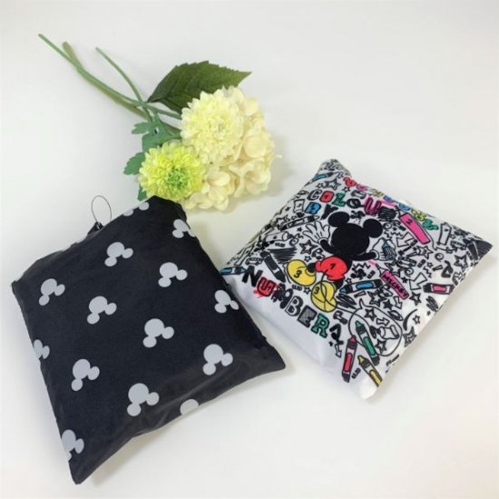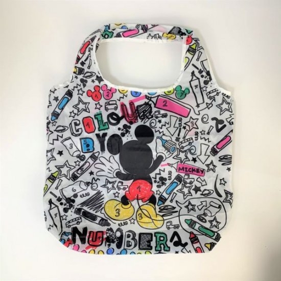 落書きに夢中なミッキーの後ろ姿がなんともキュートな折りたたみエコバッグ。