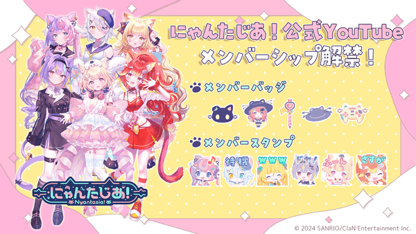株式会社ClaN Entertainment(本社:東京都港区、代表取締役社長:大井 基行)は、株式会社サンリオ(本社:東京都品川区、以下サンリオ)と共同で行うVTuberプロジェクト「にゃんたじあ!」において、にゃんたじあ!公式YouTubeチャンネルにて、有料メンバーシップを10/7(月)より開設することをお知らせします。なお、メンバーシップへの加入ができる時刻については、にゃんたじあ!公式YouTubeチャンネルで同日19:00から配信予定の「にゃまらじ!」で発表します。