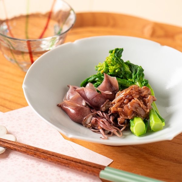 春の味覚、ホタルイカに梅なめ茸を添えて、さっと醤油をかければ梅の酸味が効いた副菜の完成です。ホタルイカのプリッとした食感と、梅なめ茸のシャキシャキ食感がくせになる、お酒のおつまみにもぴったりの一品です!