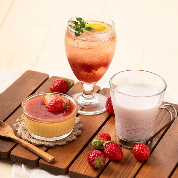 使い方はとっても簡単!「いちごミルクの素」と牛乳を1:2で混ぜるだけで、まろやかないちごミルクの完成。さらに、プリンのシロップに使えば、春にピッタリの華やかなデザートに大変身!いちごの甘酸っぱさが、さらにプリンのおいしさを一層引き立てます。