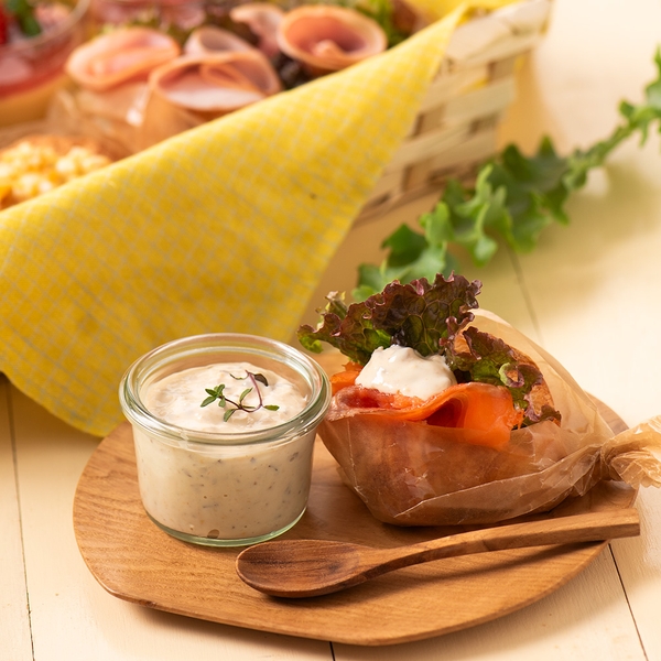 「いぶりがっこタルタル」はパンとの相性も抜群!サーモンやゆで卵、お好きなお野菜をパンにはさみ、最後にたっぷりの「いぶりがっこタルタル」をトッピングすればいぶりがっこの贅沢サンドの完成!これからの春の季節、ピクニックやお花見のお供にぴったりの一品です!