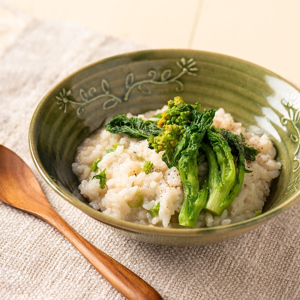 春のいちおしレシピは「粉末万能だしの和風リゾット」。仕上げに「粉末万能だし」をふりかければ、だしの風味がふんわり香る和風リゾットの完成です。最後に菜の花をトッピングすれば、春らしい彩りも楽しめる一皿に!