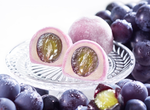爽快な香り、あふれる果汁と甘さの山梨県産種なしピオーネを使用。ぶどうの美味しさを味わえるよう大粒なものを厳選し、北海道産手亡豆を白州名水で丁寧に炊き上げたすっきりとした甘さの白あんと、国産巨峰ピューレを加えた餅で包みました。