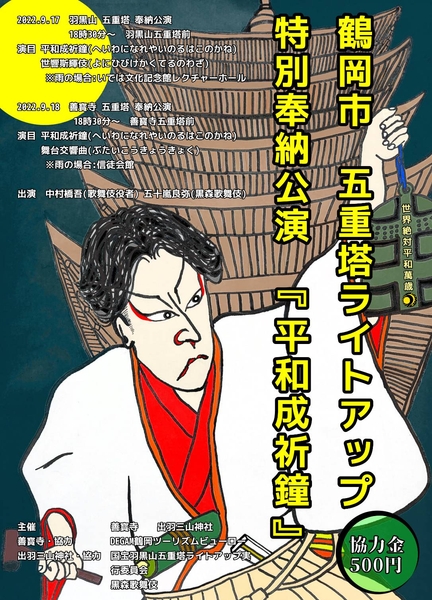 山形県の国宝および無形文化財それぞれの五重塔の前で、鶴岡市出身の歌舞伎役者、中村橋吾氏(成駒屋)が特別演舞を行う。