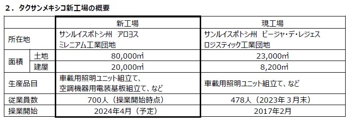 当社は、タクサンメキシコ新工場が有する、「ユニット組立て」および「電装基板組立て」の機能に加え、将来的には「部品成型」「板金加工」「完成品組立て」の諸機能を備えた一貫生産体制に拡張させ、今後ますます機会増大が見込まれる米国市場向け生産需要を取り込み、メキシコにおけるEMS事業を、操業開始後5年以内に売上高500億円、約2,000人の雇用を創出する、当社グループ最大のEMS事業拠点を目指しております。