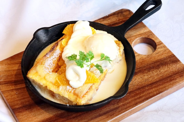 オレンジリキュール香るフレンチトースト。表面を香ばしく炙ったブリュレ仕立てに、キャラメルバニラアイスを添えて。
