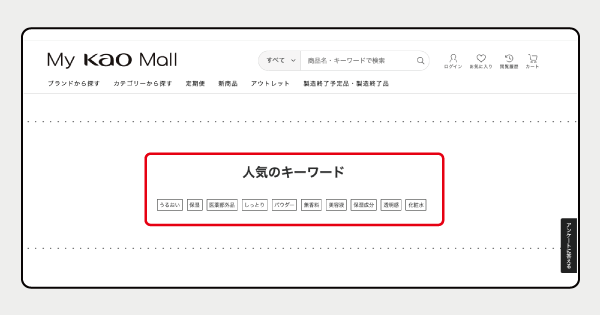 TOPページに『人気のキーワード』として同サイトでよく検索されているキーワードや最新のトレンドワードを掲出することで、ユーザーへサイト内の回遊を促し新たな商品との出会いを創出しています。