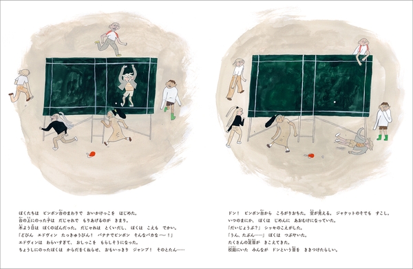 「どびん エドヴィン たっきゅうびん!バナナでピンポン そんなバカな~! 休み時間に友だちとだじゃれ遊びでもりあがり、卓球台の上からジャンプをしたら、 ドン!! じめんにおちちゃった。集まってきた学校のみんなは、あふれでる血にくぎづけ。みんなに注目されるのはちょっといい気分。でもどんどん痛くなってきて......。