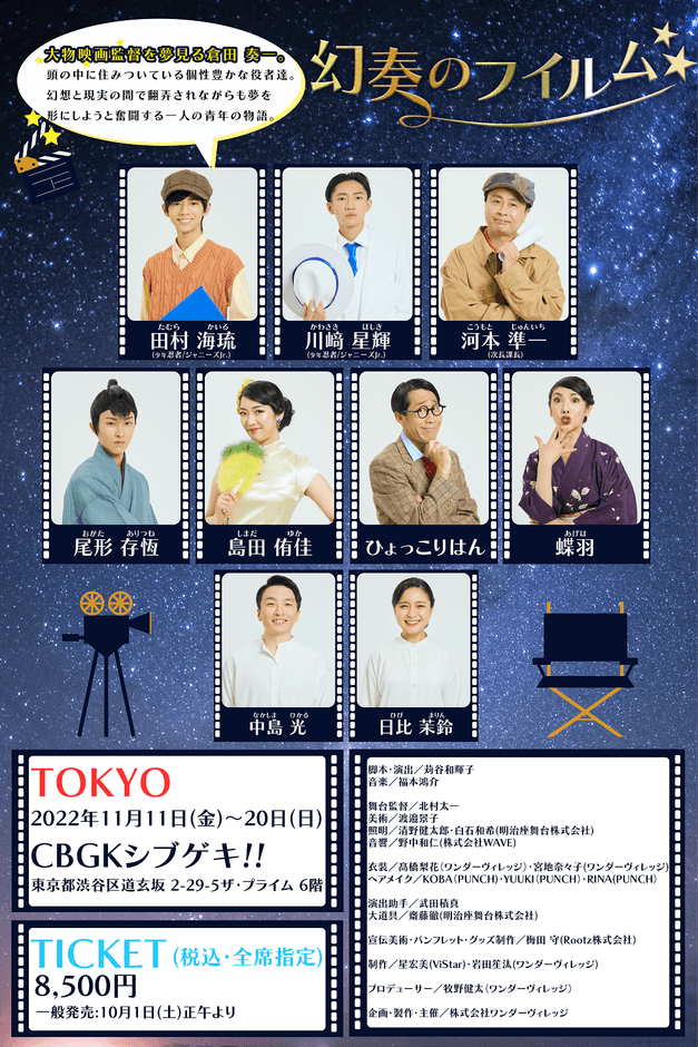 株式会社ワンダーヴィレッジ(東京都港区、プロデューサー牧野健太)、『幻奏のフイルム』が2022年11⽉11⽇(⾦)〜11⽉20⽇(⽇)にCBGKシブゲキ!!(東京都渋谷区道玄坂2丁目29−5 6階)にて上演されます。