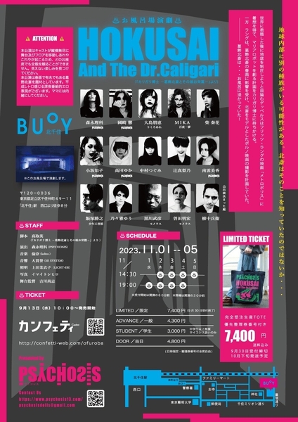 PSYCHOSIS File:005 ♨お風呂場演劇♨『HOKUSAI And The Dr.Caligari』が2023年11月1日 (水) ~2023年11月5日 (日)に北千住BUoY(東京都足立区千住仲町49-11)にて上演されます。