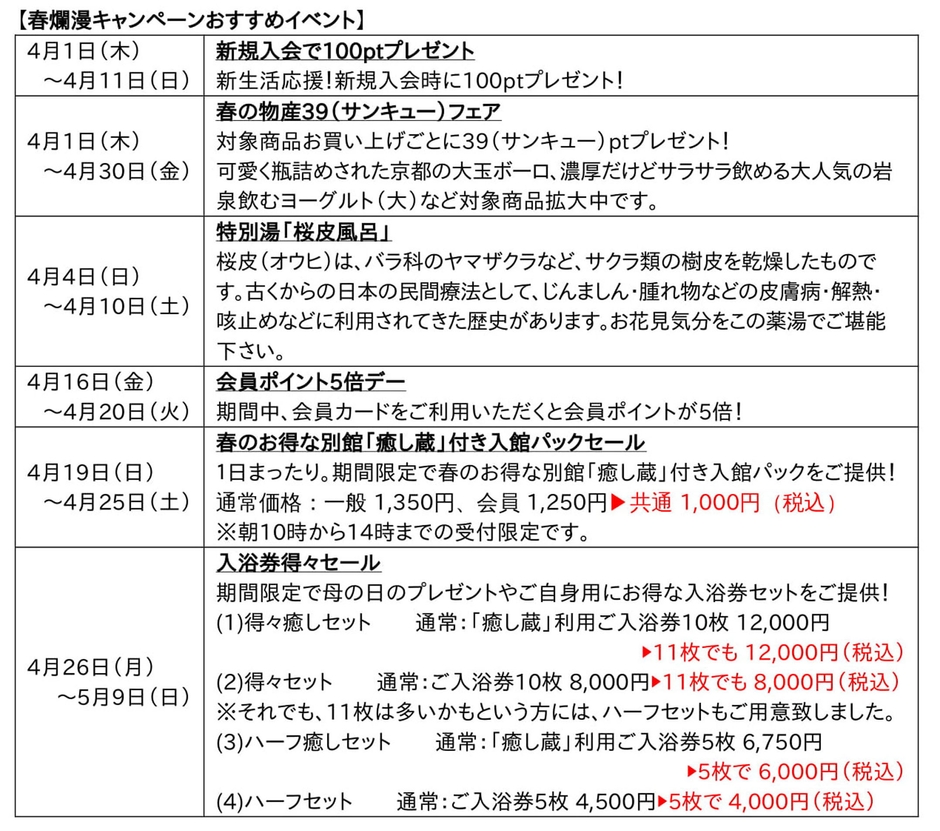 グンゼ株式会社(本社:大阪市北区、社長:廣地 厚)の連結子会社であるグンゼ開発株式会社(本社:兵庫県尼崎市、社長:赤瀬 康宏)が運営する商業施設グンゼタウンセンターつかしんにある天然温泉「湯の華廊」では、4月1日(木)から春爛漫キャンペーンを開催致します。4月上旬、つかしんではせせらぎ通り伊丹川沿いの桜が見頃となります。今月は、この時期に相応しい桜皮風呂をご用意致しました。この機会に湯の華廊へお越しいただき、特別湯にておくつろぎ下さい。