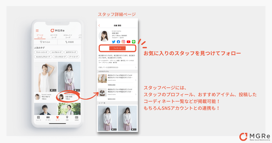 MGRe オリジナル機能③:店舗ページにスタッフ情報と最新コーデ情報を紐付け