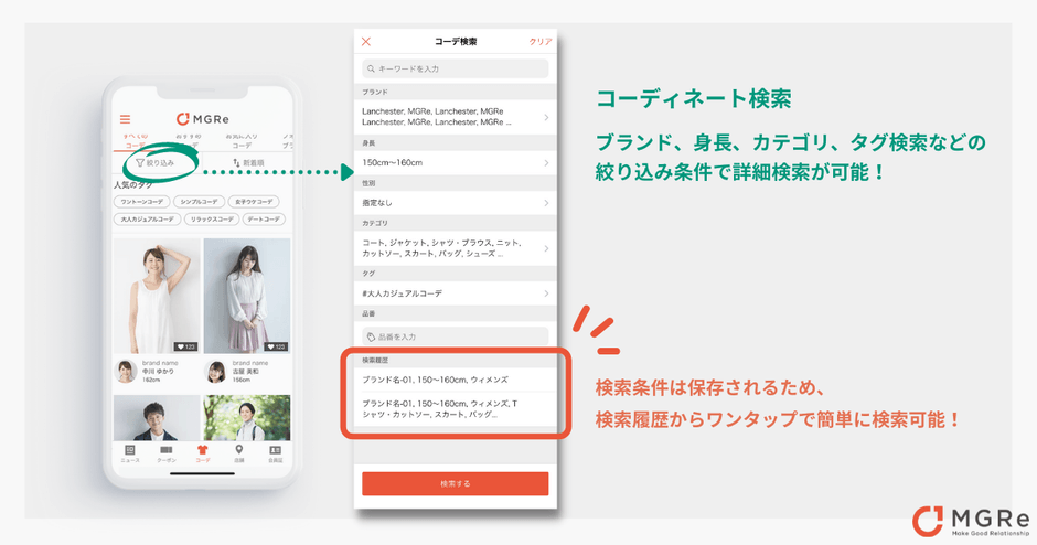 STAFF STARTは、店舗スタッフが撮影したコーディネート写真に商品情報を紐付け、ECサイトやSNSに投稿できるツールです。STAFF START × MGRe本連携により、アプリ上にも投稿したコーディネートを反映することが可能になります。アプリ内にスタッフコーディネートコンテンツが展開されることでアプリのアクティブ率向上、また、スタッフのスタイリングを参考にすることで購買率を高めることが期待できます。コーディネートは閲覧数、お気に入り登録数などのランキング表示などさまざまなレイアウトが可能です。また、「タグ検索」やブランド、身長、カテゴリなどを指定できる「詳細検索」もアプリ上に実装しております。ユーザーが指定した検索条件は「検索履歴」に保存されるため、都度、検索条件を設定する必要なく、ワンタップで指定条件を呼び出せるユーザーにとってストレスフリーな実装を実現しています。